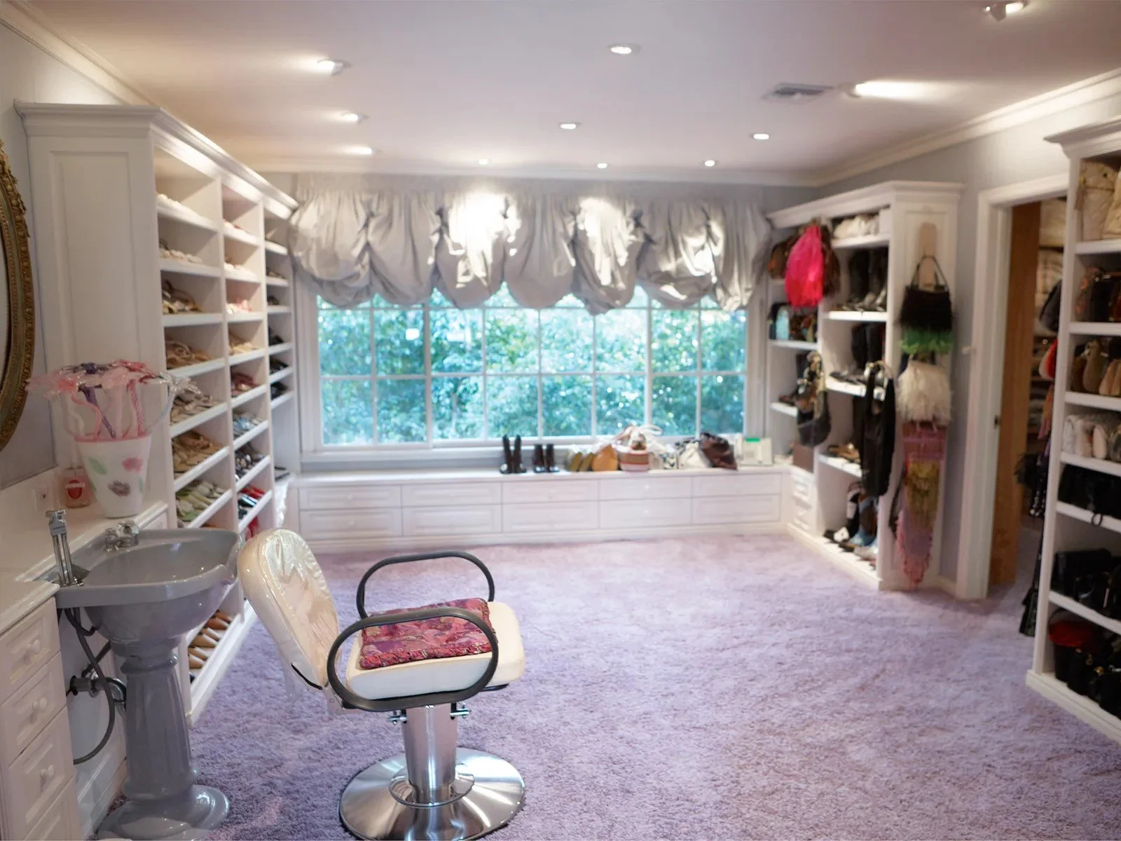 Ascend was very fortunate to be chosen, in the middle of 2008, to supply the shag pile merino wool carpet for Elizabeth Taylor’s house via Westwood Carpets in Beverly Boulevard. Around 175 square yards of natural white merino wool shag pile product was used in the shoe room, dressing room and parts of the living area. The Bambino II was installed in ‘The Shoe Closet’.